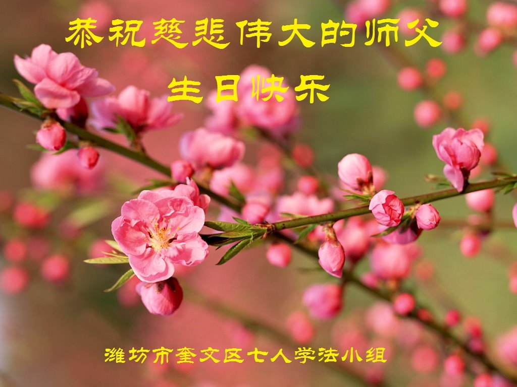 师父辛苦了!我们坊子区两个学法小组弟子恭祝慈悲伟大的师父生日快乐!我们一定会跟随师父走好最后的修炼路,救度更多的众生,圆满随师还。愿师父少一些操劳,多一些欣慰! 山东潍坊市一家四人恭祝慈悲伟大的师尊生日快乐!普天同庆五·一三世界法轮大法日!