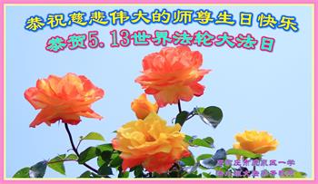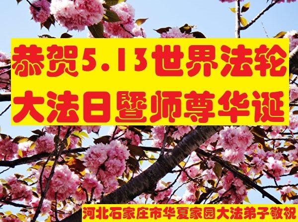 恭贺世界法轮大法日! 2020年5月13日,第21个世界法轮大法日,大法洪传世间28周年,我们再次迎来了这个人间、天上乃至寰宇一切的生命都感恩、庆贺的节日! 弟子感恩师父将大法恩赐予众生。浊世洪流中,无论多么艰难,只要想起师父,想起大法的法理,总能烟消云散、一片清亮。信师信法,世事总能“柳暗花明又一村”。弟子感恩师父!在此,代表所有我们能代表的一切众生向师父问好!恭祝师父生日快乐!法轮大法日快乐! 2020年5月5日 河北省石家庄市鹿泉区大法弟子恭祝师尊生日快乐!暨世界法轮大法日!
