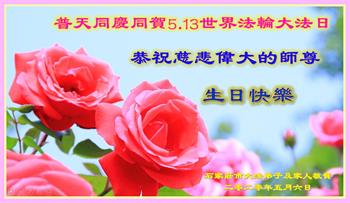 【明慧网二零二零年五月十一日】 河北省石家庄市一大法弟子全家恭祝师尊生日快乐!