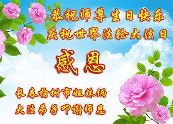 庆祝世界法轮大法日! 吉林省长春榆树市姐妹俩大法弟子叩谢师恩! 吉林省长春市一大法弟子恭祝师尊生日快乐!