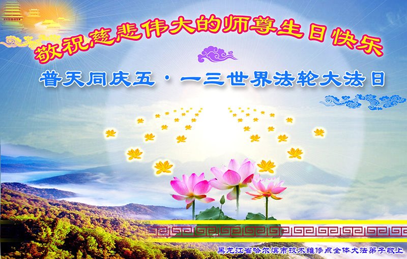 黑龙江省哈尔滨技术维修点全体大法弟子敬祝师尊生日快乐!普天同庆五·一三世界法轮大法日!