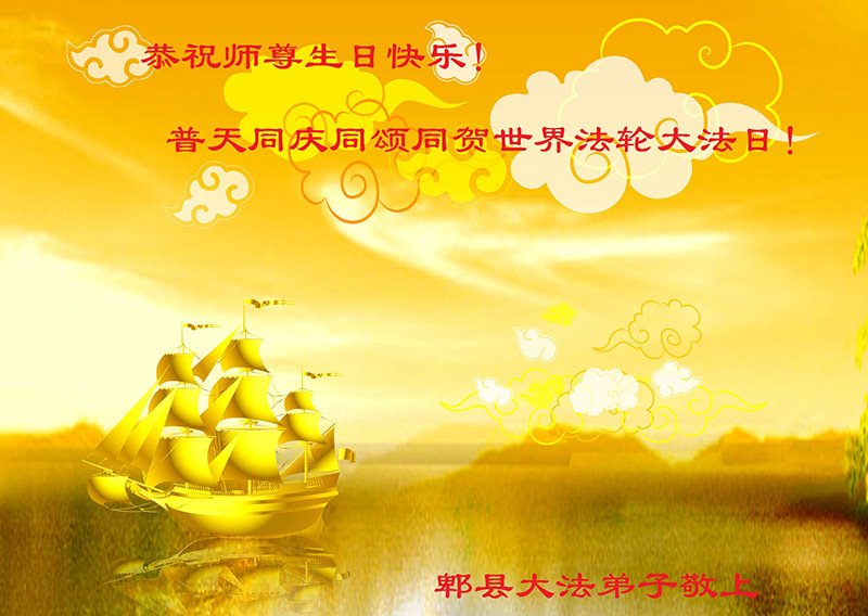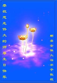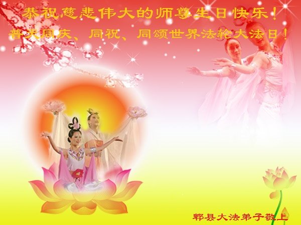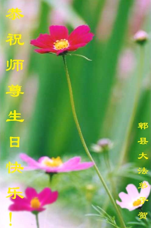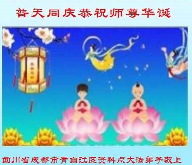 师尊您好!师尊辛苦了!无限感恩师尊的慈悲救度,无限感恩师尊对弟子的时刻看护,弟子唯有勇猛精進不负师恩,圆满随师还。弟子叩拜师尊。 四川省成都市郫县大法弟子恭祝慈悲伟大的师尊生日快乐!恭贺世界法轮大法日!