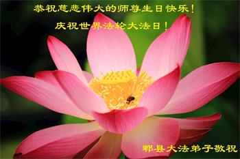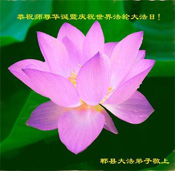 师尊您好!师尊辛苦了!无限感恩师尊的慈悲救度,无限感恩师尊对弟子的时刻看护,弟子唯有勇猛精進不负师恩,圆满随师还。弟子叩拜师尊。 四川省成都市郫县大法弟子恭祝慈悲伟大的师尊生日快乐!庆祝世界法轮大法日!