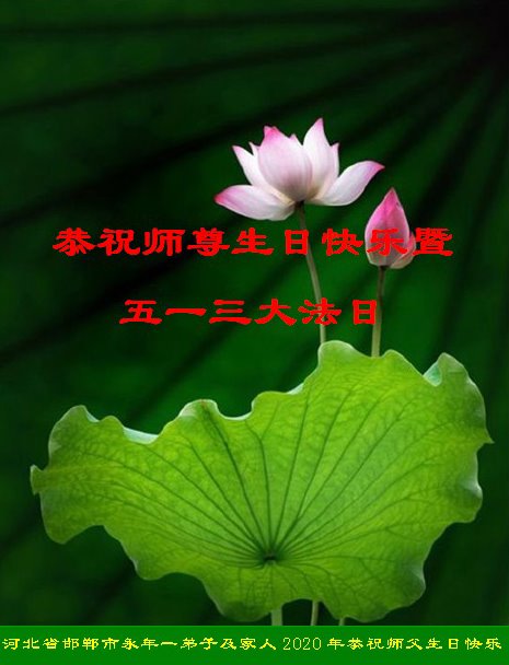 恭贺世界法轮大法日! 在法轮大法日即将到来之际,弟子及家人恭祝师尊华诞!恭祝世界法轮大法日! 在喜迎第二十一届世界法轮大法日,普天同庆、同祝、同颂的欢庆时刻,我们更加思念远在大洋彼岸的伟大师尊,不禁泪水涟涟。无限感恩的千言万语转化成更加精進的动力,听师尊的话,学好法,向内找,实修自己,认真做好三件事,在正法修炼的路上走好、走正,完成史前大愿,不辜负师尊的慈悲苦度,跪迎师尊回家乡。 河北省邯郸市一大法弟子跪拜敬上 二零二零年五月五日 河北省邯郸市永年县一大法弟子及家人2020年恭祝师父生日快乐!