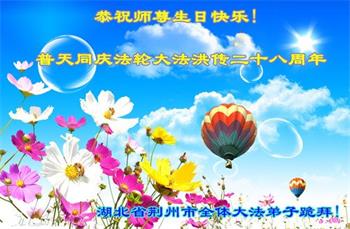 湖北省荆州市全体大法弟子恭祝师尊生日快乐!普天同庆法轮大法洪传二十八周年!