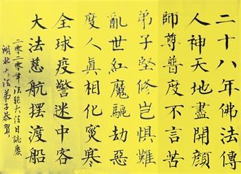 恭祝师尊生日快乐! 我们一定听师父的教诲,多讲真相多救人,在疫情中一定精進再精進,请师父放心。 弟子叩拜师尊! 武汉市武昌区大法弟子敬上 2020年5月8日 |