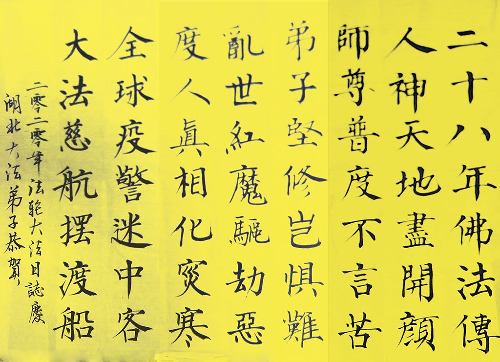 2020年5月13日是第二十一届世界法轮大法日!法轮大法洪传二十八周年暨师尊华诞的日子!石家庄市长安区几位老弟子谨以此诗献给师尊!以表寸心: 谢师恩 壬申猴年大法传 庚子鼠岁天地翻 二十年来血洗尘 弟子助师志更坚 武汉起疫肇始端 红魔画皮全揭穿 迷途众生快醒悟 找回真相上彼岸 湖北省天门市大法弟子恭贺法轮大法洪传二十八周年!恭祝师尊生日快乐!感谢师尊的慈悲苦度!