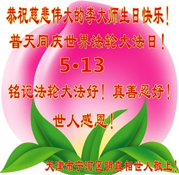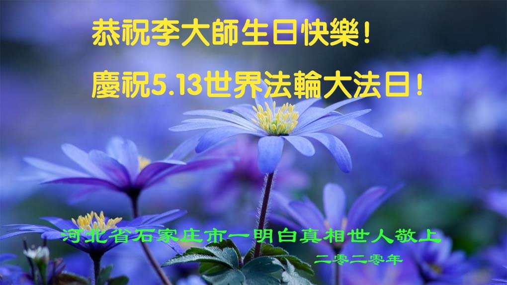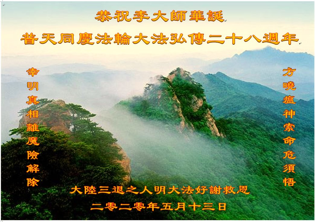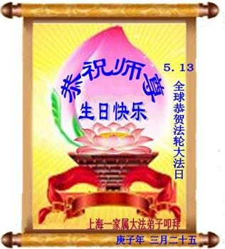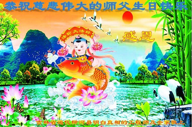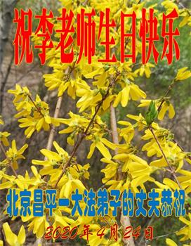 | 【明慧网二零二零年五月十一日】时光如梭,又是一年的五月十三,这是一个感恩的日子!相信法轮大法好、真善忍好的人们,有的获得了超然的人生境界,有的得到了身体的健康、长寿,有的生意兴隆,有的得到了家庭的和睦幸福…… 正如李洪志师父在《洪吟二》〈大法行 宋词〉中所写:“三字真言 理白言明 常人知表得厚福 官吏知淺明如鏡 王知理 安邦治國 得太平 出盛世”。在李洪志师父六十九岁华诞和世界法轮大法日到来之时,各界民众表达他们对李洪志先生的敬仰和感恩。 河北省石家庄市市民写道:“大法的高深法理照亮我内心的黑暗,让我明白了做人的基本道理。我在家庭矛盾中,能够把个人利益逐步看淡了。我想这样超然的活着真是一种美好的人生境界。” 湖南省益阳县一96岁老人因病三次住院,花费数万元,无法治愈,真心接受大法弟子劝善,在身心有任何病态时,诚念“法轮大法好,真善忍好”,仅仅一周身体便得到康复。 云南省昆明市明真相民众张氏家族祝贺5.13世界法轮大法日!恭祝李大师华诞快乐!“我能有今天的幸福,都是大法给予的!”北京昌平一大法弟子携丈夫恭祝恩师生日快乐! 修炼五年,我发自肺腑的想说:有师父真好,修炼大法最幸福! 因为工作关系,我需要和多个厂家打交道,厂家领导对我的评价很高。有的说:“合作了这么多人,就你的人性最好。”有的说:“你工作认真,是个好人。”有的仅见一面,就说对我印象很好。 在单位里,同事们也学着我的言行。有个同事前两天说:“你看我变好了,都是你熏陶的。”这个同事之前很自私,党文化观念很重,我有点嫌弃。师父在梦中点化我,让我去掉分别心,把所有的众生要当作亲人。 同事对大法不理解,我就耐心的告诉她真相,修炼法轮功的都是按照真善忍做人,都是好人。大法资料都是修炼人自己省吃俭用的钱印制的,为了是让众生明真相。同事慢慢明白了真相,做了三:退.。这都是师父的功劳,我只是动动嘴。 娘家兄妹和谐,相互友爱关心。婆家是个大家族,一次大家出去旅游,晚上回来大家都累了,躺在床上,我一个人忙前忙后,把食物准备好了,送到大家手上。大姑姐当时就说:“你的修为很高。” 丈夫未修炼,但很支持我修炼。我不会用电脑,丈夫就耐心的帮助我做大法的事。513快到了,丈夫让我送上恭祝:祝李老师生日快乐! 我能有今天的幸福,都是大法给予的!我要把真善忍的光辉撒到所有来到身边的众生!恭祝恩师生日快乐! 北京昌平大法弟子携丈夫叩拜! 2020年4月24日 认同大法好 生意兴隆山东招远乡村一生意人全家恭祝大法师父生日快乐! 我从心里相信法轮大法好,每年我家都贴真相对联,我们全家人也都做了三:退.。大法师父照应我的生意红火,买卖兴隆。 这次大瘟疫是针对共产党来的,就是解体中共的,谁摊上了都不是无缘无故的,好人有好报!感谢大法师父的救度!我代表全家人恭祝李大师生日快乐! 黑龙江省哈尔滨市宾县全体明真相世人恭祝李大师生日快乐!法轮大法照亮了我的心 获得超然的人生的境界河北省石家庄市一明白真相世人恭贺李大师生日快乐!庆祝世界法轮大法日! 在二十多年前,我就深知法轮大法是佛家修炼功法,是能使人类道德回升的高德大法。时至今日,我万分感激李大师,大法的高深法理照亮我内心的黑暗,让我明白了做人的基本道理。我在家庭矛盾中,能够把个人利益逐步看淡了,一些经济纠纷也能舍掉了。我想这样超然的活着真是一种美好的人生境界。 多年前,我看过李大师的著作《转法轮》,也学炼过一些动作,但是,由于忙于生计,一直没有时间去修炼。但是,我会告诉其他亲朋好友,法轮大法好!告诉他们“天灭中共”,“中共病毒”——“武汉肺炎”对世人的危害极大,一定告诉他们远离中共才能平安!只有退出邪恶中共的党、团、队组织,诚心默念九字吉言——“法轮大法好,真、善、忍好”方可保命!感谢李大师让我明白了这么多! 感恩跪拜! 二零二零年四月四日 真心接受大法弟子劝善 96岁老人一周康复湖南省一96岁明真相老人诚祝师父生日快乐! 湖南省益阳县一96岁老人(未修炼法轮功)因病三次住院,花费数万元,无法治愈,真心接受大法弟子劝善,在身心有任何病态的情况时,诚念:“法轮大法好,真善忍好”,仅仅一周身体便得到康复。 在大法师父生日来临之际,真诚祝李洪志师父生日快乐! 2020年4月21日 黑龙江省佳木斯地区明真相民众感恩大法赐给人类的光明!恭祝李洪志大师华诞快乐!辽宁省本溪市一大法弟子家属祝贺师父生日快乐!恭贺世界法轮大法日!我在大学读书,我姥姥学大法,我也跟着受益,师父也在看护着我,使我身心健康的成长。谢谢师父! 吉林省通化柳河县明白真相的工程师及全家恭祝师父生日快乐!庆祝5.13世界法轮大法日! 我是大法弟子家属,我虽没修炼。但我能用“真、善、忍”的标准要求自己,不占别人便宜,做事能为别人着想,家庭和睦,婆媳关系融洽,我工作顺利,心想事成。 我外甥女读重点高中的重点班,她会背《论语》及部份《洪吟》,看到钱不捡,同学之间能忍让、宽容。 我女儿5岁半,也会背10余首《洪吟》,经常念大法好、师父好!活泼可爱。我们都身体健康。他们都主动跪拜大法师父法像,感恩大法师父慈悲保护。我们全家人再次祝大法师父生日快乐!合十! 辽宁省抚顺市望花区大法弟子家人恭祝慈悲伟大的师尊生日快乐!我们