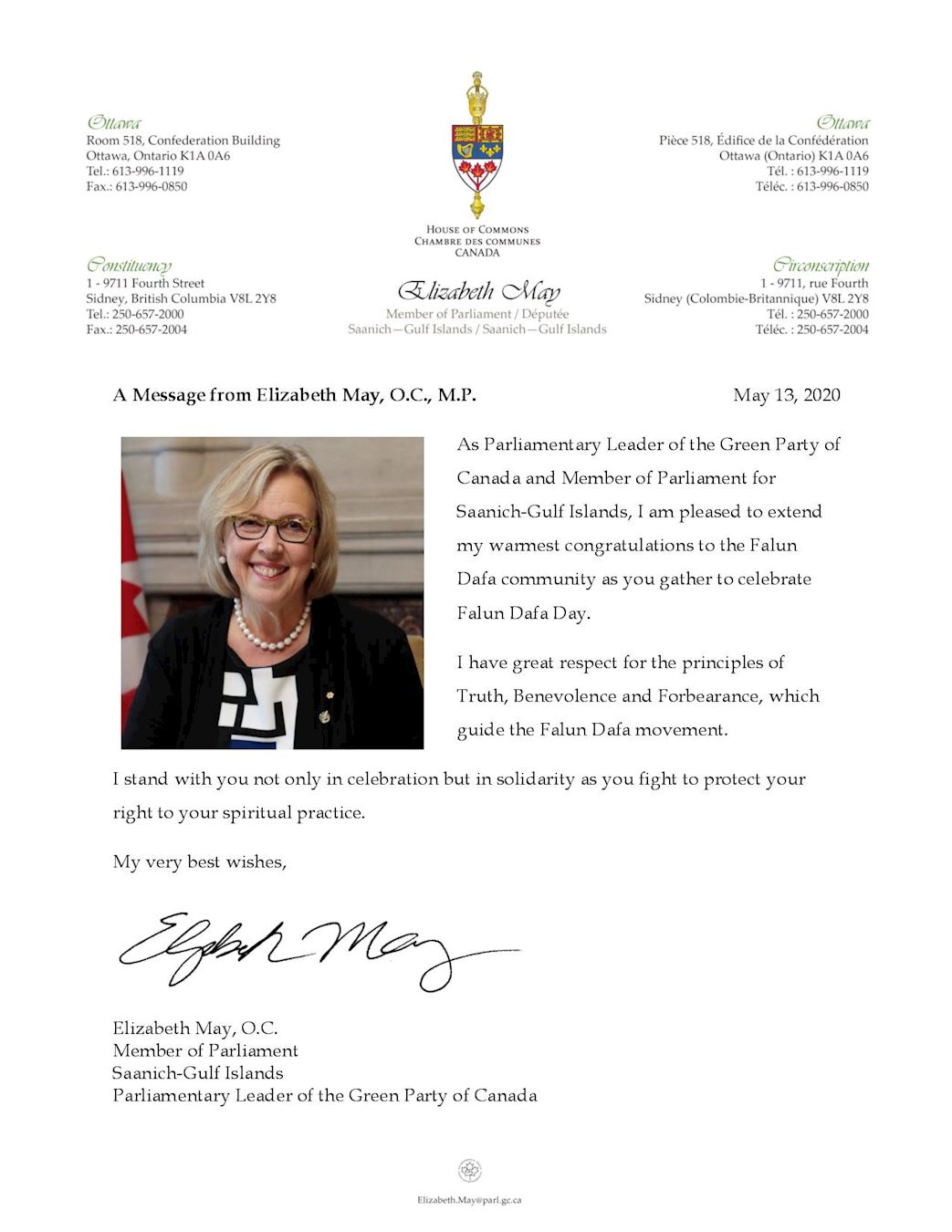 【明慧网二零二零年五月十一日】2020年5月13日是法轮大法开传28周年纪念日、第21届“世界法轮大法日”,也是法轮功创始人李洪志先生69岁的华诞。在此普天同庆的日子,加拿大联邦、省、市议员纷纷向法轮大法学会发来贺信、嘉奖令和褒奖。下面是加拿大西部的3位国会议员和7位市长发来的贺信和褒奖。 图1:来自绿党领袖、国会议员Elizabeth May的贺信 |