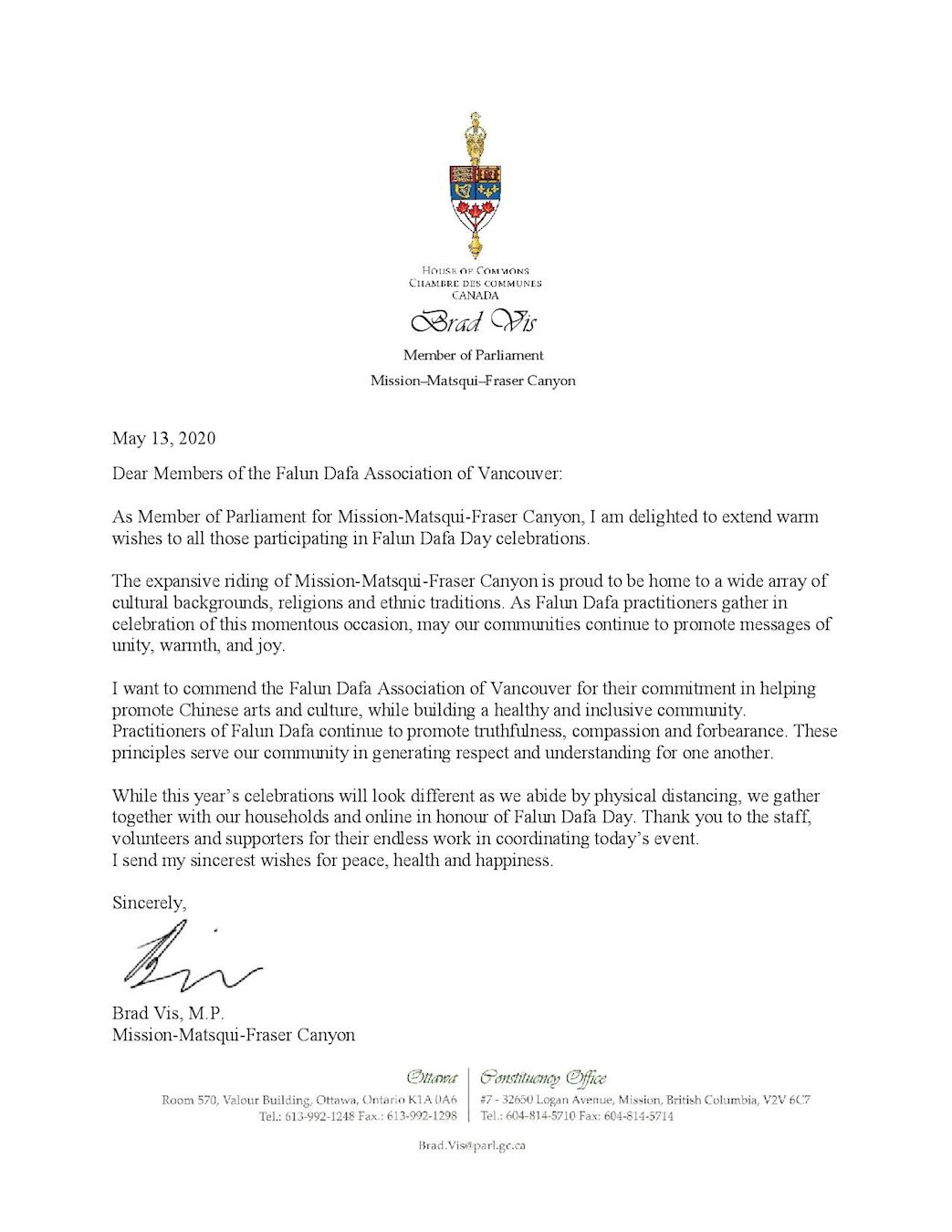 来自绿党领袖、国会议员Elizabeth May的贺信: 在法轮大法日到来之际,作为加拿大绿党领袖和Saanich—Gulf Islands选区的国会议员,谨向你们的庆祝活动送上我最诚挚的祝福。 我非常敬重法轮大法所倡导的“真善忍”原则。我与你们站在一起,不仅是在此时的欢庆时刻,也在你们为捍卫信仰而努力之时,坚定的支持你们。 最衷心的祝愿, 国会议员Elizabeth May  图2:来自米什-马兹奎-菲沙坎农(Mission-Matsqui-Fraser Canyon )的国会议员Brad Vis的贺信 |