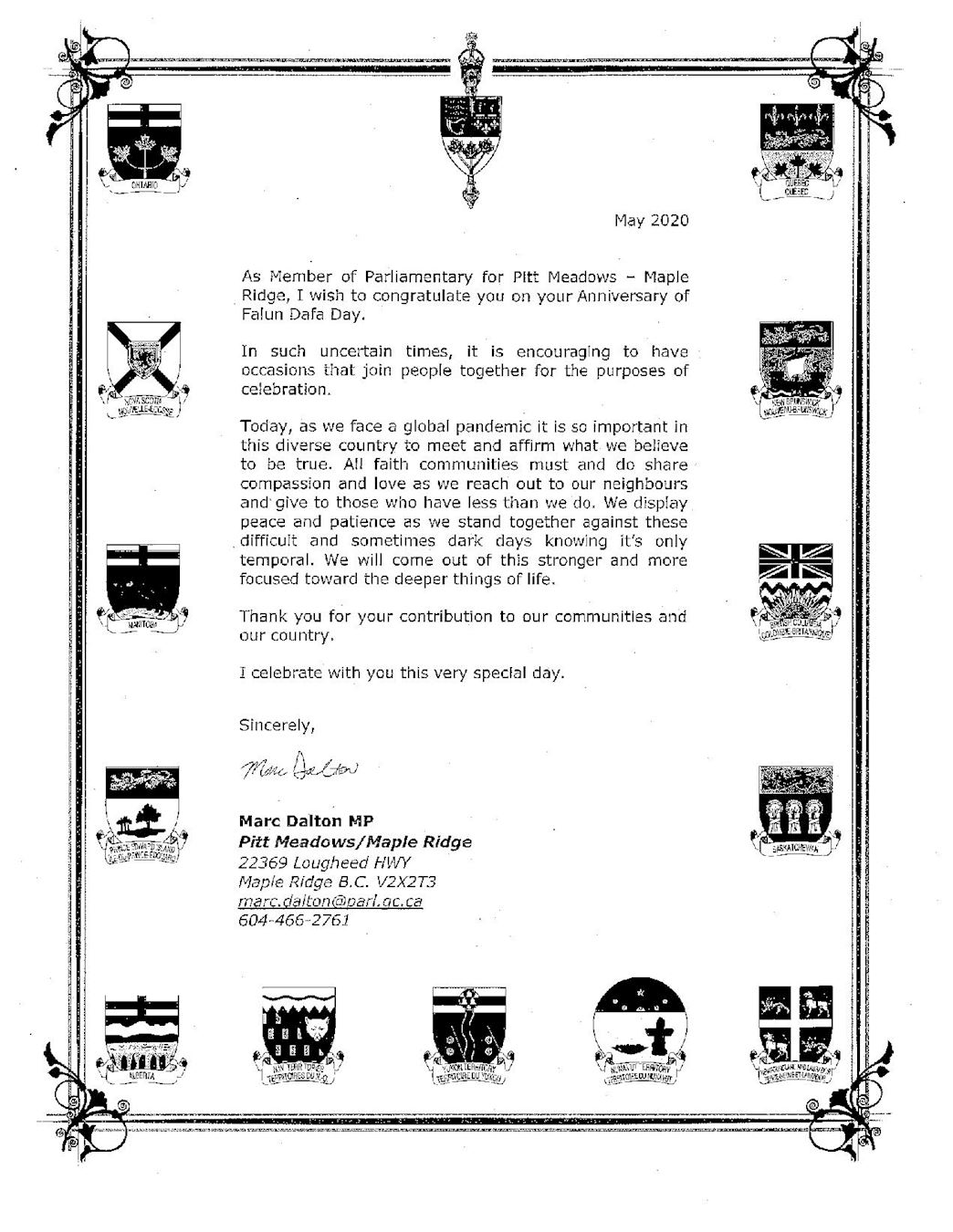 来自米什-马兹奎-菲沙坎农(Mission-Matsqui-Fraser Canyon )的国会议员Brad Vis的贺信: 尊敬的温哥华法轮大法学会会员们: 作为米什-马兹奎-菲沙坎农(Mission-Matsqui-Fraser Canyon )选区的国会议员,很荣幸的向所有参加“法轮大法日”庆祝活动的人们表示祝贺。 广阔的米什-马兹奎-菲沙坎农(Mission-Matsqui-Fraser Canyon )以拥有各种不同的文化背景、宗教和民族传统为自豪。 在法轮大法学员们欢聚庆祝这个重要日子之际,愿我们的社区继续散发团结、热情和欢乐的讯息。 我要赞扬温哥华法轮大法学会为弘扬中国文化艺术,帮助建立一个健康、包容的社区所作出的努力。法轮大法修炼者们坚持不懈的弘扬“真善忍”,促进了我们社区人与人之间的相互尊重和理解。 尽管要保持社交距离,今年的庆祝活动会有所不同,但我们会与家人一起在网上庆祝法轮大法日。谢谢工作人员、义工及支持者们为这次活动付出的不懈努力。 送上我最衷心的祝愿:愿和平、健康和幸福相伴。 诚挚的, 国会议员Brad Vis 米什-马兹奎-菲沙坎农(Mission-Matsqui-Fraser Canyon )  图3:来自匹特草原-枫树岭(Pitt Meadows-Maple Ridge )的国会议员Marc Dalton的贺信 |