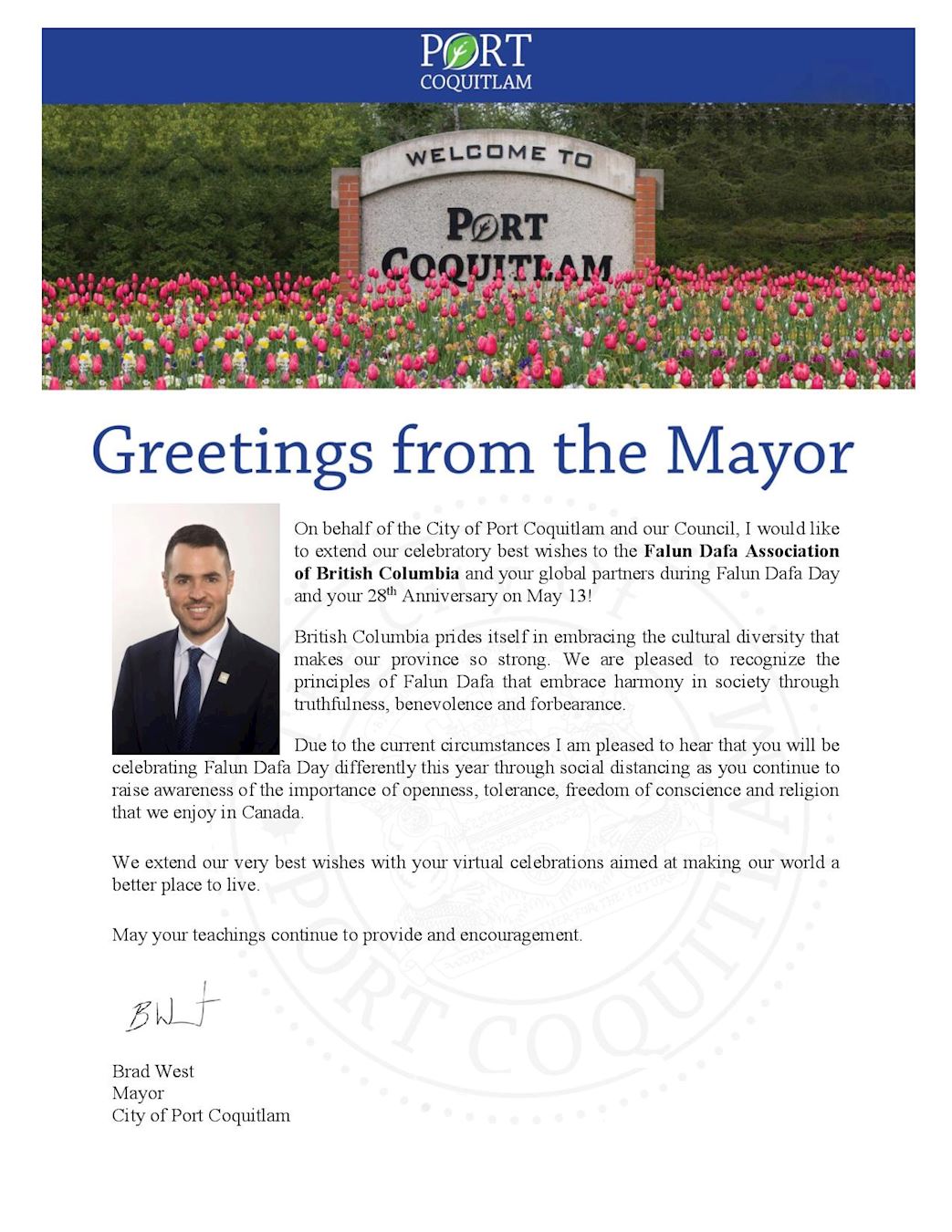 来自高贵林港市长韦斯特(Brad West)的贺信: 在5月13日法轮大法日及法轮大法洪传28周年之际,谨代表高贵林港及市议会,向卑诗省法轮大法学会和全球的同仁们致以最美好的祝愿。 卑诗省拥有引以为豪的多元文化,使我省得以发展壮大。我们由衷的赞赏法轮大法所倡导的真、善、忍原则,为社会带来一片祥和。 在当前的形势下,很高兴听到你们在保持社交距离下,今年仍以不同的方式庆祝法轮大法日,并继续提高人们的意识——加拿大所拥有的开放、包容、宗教和信仰自由的可贵。 诚挚的送上我们对这次旨在为开创一个更美好的世界的庆祝活动最美好的祝福。 愿你们的功法继续弘扬并产生积极的影响! 高贵林港市长韦斯特  图5:来自温哥华地区穆迪港(Port Moody)市长罗布·瓦格拉莫夫(Rob Vagramov)的贺信 |