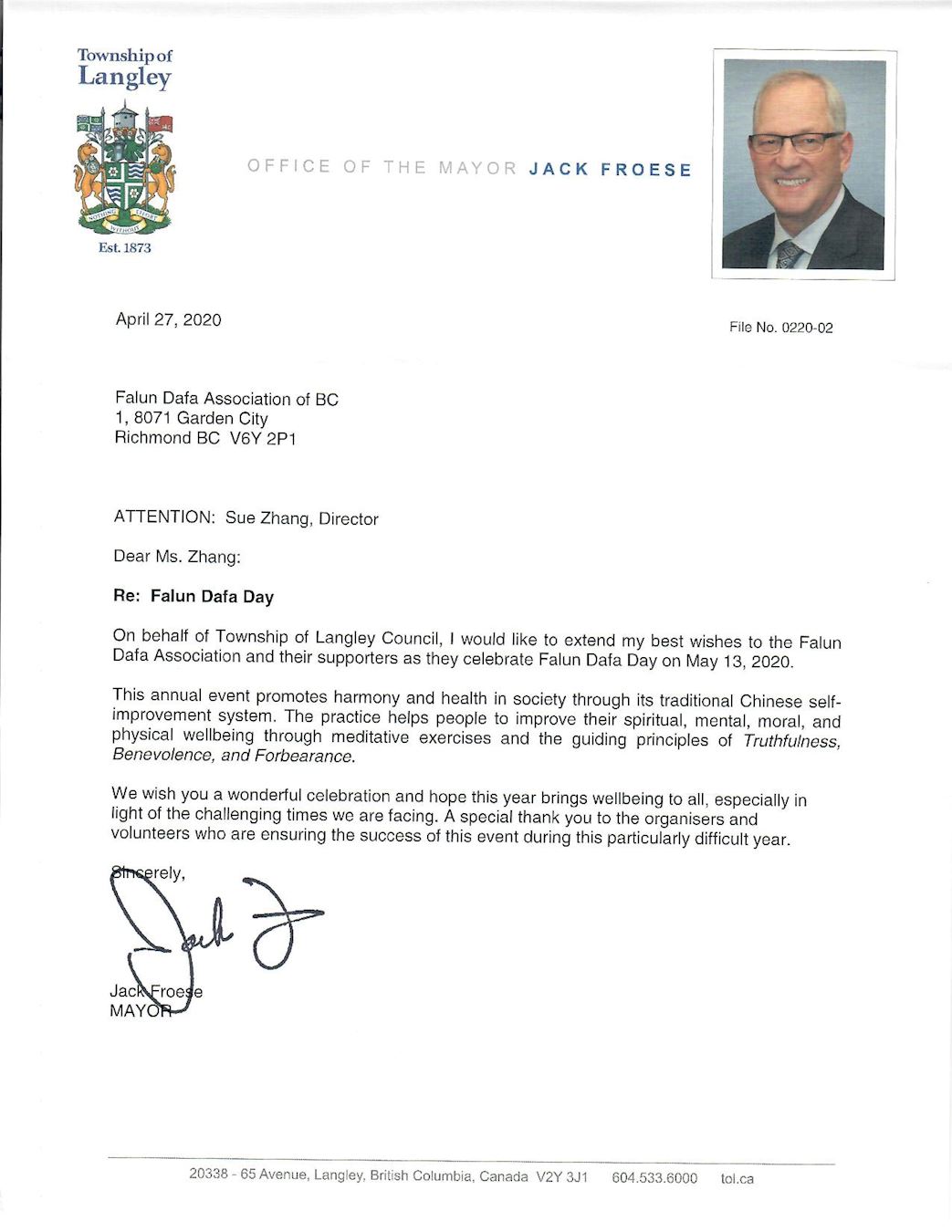 来自温哥华地区穆迪港(Port Moody)市长罗布·瓦格拉莫夫(Rob Vagramov)的贺信: 谨代表穆迪港市,向所有参加2020年5月13日法轮大法日庆祝活动的人们表达最诚挚的祝福。 作为移民,我非常感激且铭记加拿大这个拥有众多象穆迪港这样的多元文化城市的国家,而且成为来自世界各地人们的家园。法轮大法“真善忍”的指导原则通过这样的庆祝活动,给这里带来了欢庆的气氛,文化和传统的庆典使得我们的社区、省份和国家变得如此美好。尽管我们处在困难时期,要保持社交距离,不能用往年的方式庆祝法轮大法日,但无可置疑的是,我们颂赞这些价值观更凸显出其特别重大的意义。 在卑诗省及整个加拿大,我们很荣幸能够拥有开放、多元化和信仰自由的价值观。作为自豪的加拿大人,能够行使自己的权利和自由而心存感激。祝你们法轮大法日快乐。 此致, 穆迪港(Port Moody)市长 罗布·瓦格拉莫夫  图6:来自兰里镇区(Township of Langley)市长杰克·弗洛斯(Jack Froese)的贺信 |