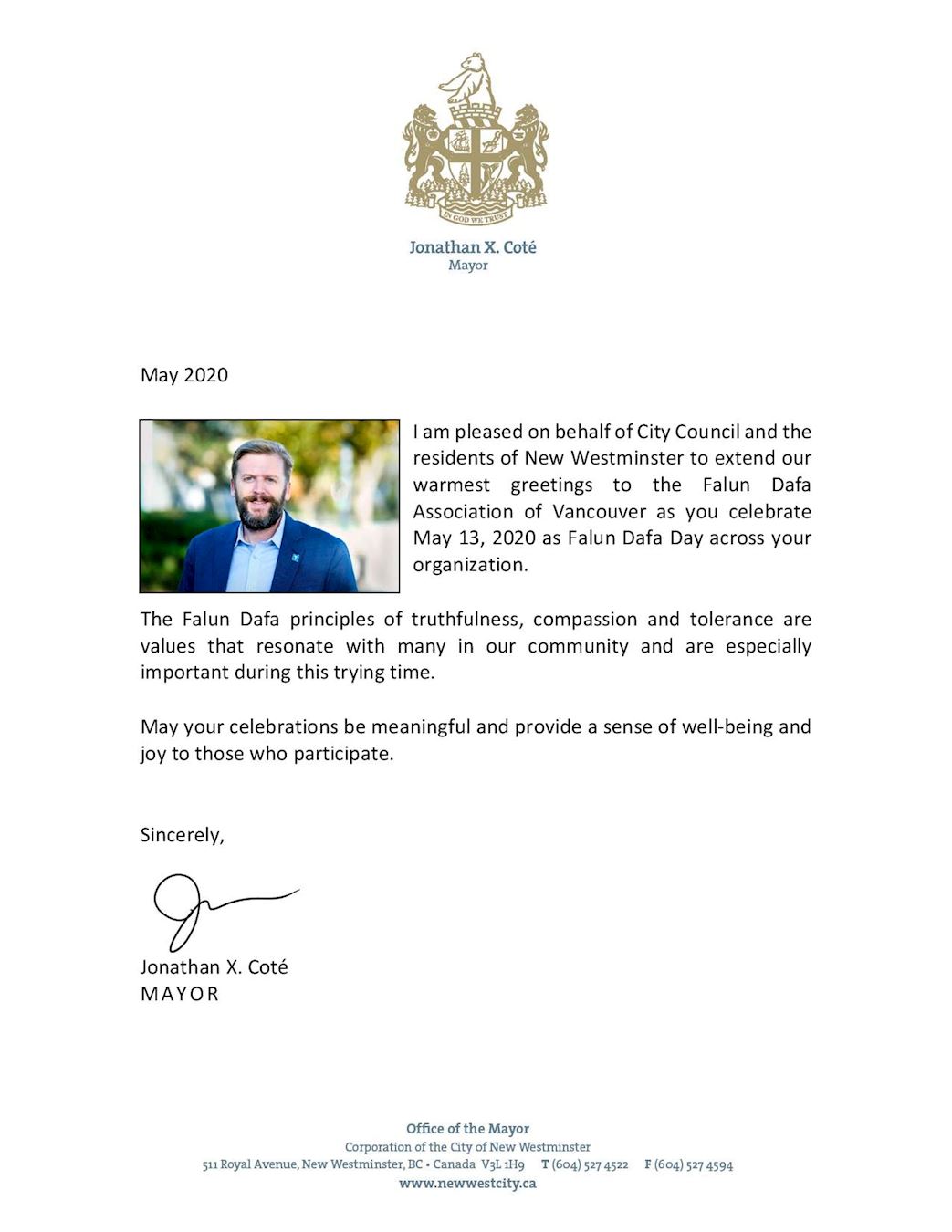来自兰里镇区(Township of Langley)市长杰克·弗洛斯(Jack Froese)的贺信: 在庆祝2020年5月13日法轮大法日之际,谨代表兰里镇区议会,向法轮大法学会及支持者们致以最诚挚的问候。 一年一度的庆祝活动,这个中国传统的自我提升功法促进了社区的祥和与健康。人们通过打坐炼功,并按照“真、善、忍”的指导原则,得到了精神、道德的升华和身心的健康。 愿你们的庆祝活动成功,尤其是在当前的困难时期,希望你们把福音带给所有人。特别感谢为此次活动付出的组织者和义工们。 诚挚的, 杰克·弗洛斯市长  图7:来自温哥华地区新西敏市长乔纳森·科特(Jonathan Coté)的贺信 |