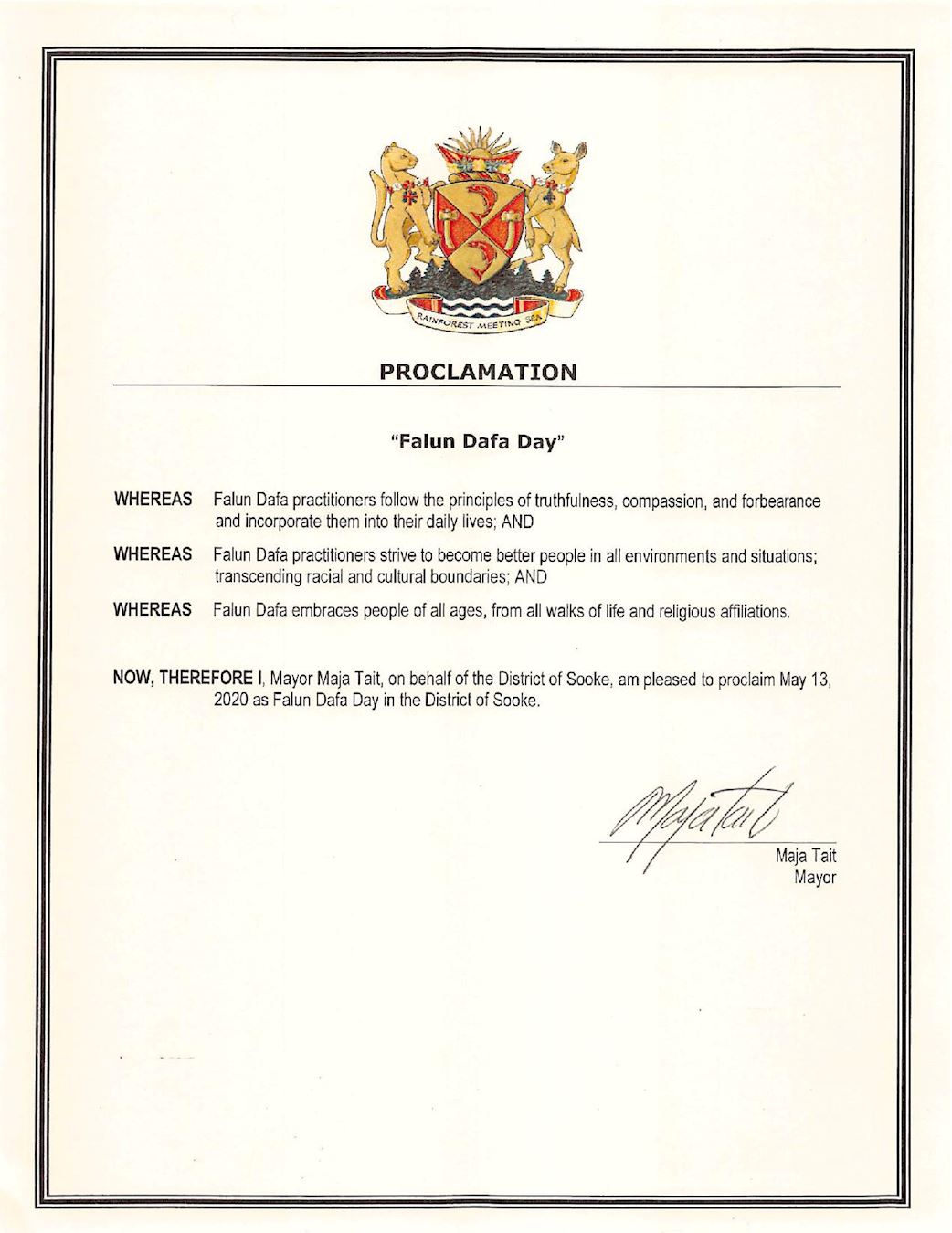 来自卑诗省苏克地区(District of Sooke)市长的褒奖: 鉴于,法轮大法修炼者在日常生活中遵循“真善忍”的修炼原则; 鉴于,法轮大法修炼者注重心性的提高,在任何环境、任何情况下都要求做一个更好的人;超越文化及种族的界限; 鉴于,法轮大法广度众生,没有年龄、职业及宗教信仰的区分; 鉴此,我,苏克地区市长玛雅·泰特(Maja Tait),特此宣布二零二零年五月十三日为苏克地区“法轮大法日” 市长玛雅·泰特