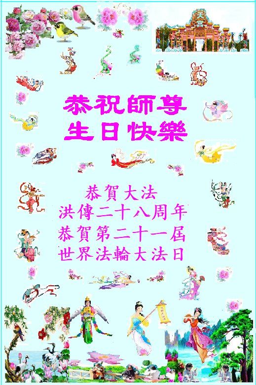 慈悲的师尊您好!2020年世界法轮大法日来到了,在这喜庆的时刻,奉上弟子最美好的祝愿,愿师尊生日快乐!师父,我在网上看了获奖影片《黑暗中的曙光》,被感动的一直在流泪。是啊,师父心里装的是天下所有的人,一直在给予世人被救度的机会。路,再难,也要往前走,直到光明!谢谢师尊! 北京石景山一大法弟子叩拜!合十 师尊创世到人间 绚丽花开五月天 红尘乱世闻大法 兑约励志谱新篇 北京海淀区一大法弟子恭祝慈悲伟大的师尊生日快乐!庆祝世界法轮大法日!