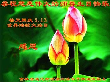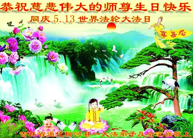 弟子感谢师尊一路保护,唯有精進,再精進! 弟子叩拜师尊 吉林省通化柳河县一大法弟子及家人恭祝慈悲伟大师尊生日快乐!同庆5·13世界法轮大法日!