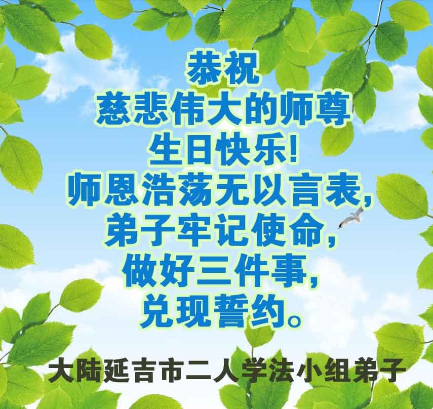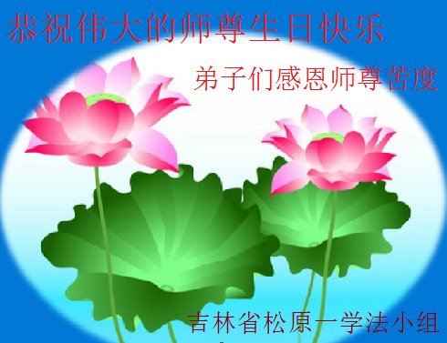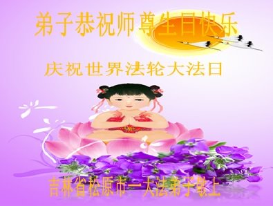 恭祝师父华诞快乐!普天同庆5·13世界法轮大法日!弟子加倍努力做好三件事。 吉林省松原长岭一大法弟子恭祝师父生日快乐!