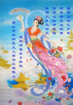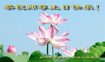 师尊慈悲度众生, 法徒随师救人忙。 只盼众生快醒悟, 回归之路永留芳。 河北省唐山市丰润区九人学法小组大法弟子恭祝慈悲伟大的师尊生日快乐!