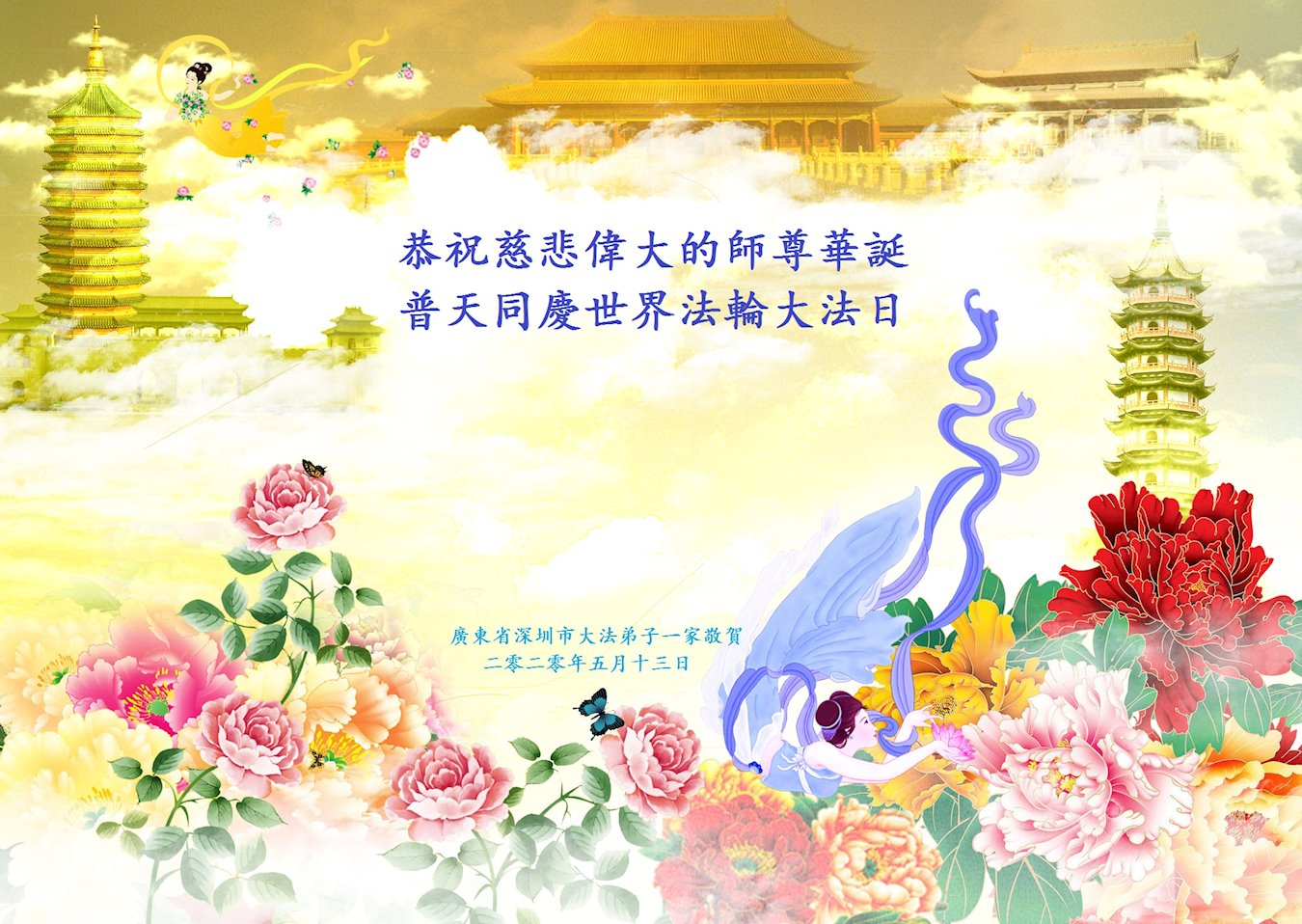 【明慧网二零二零年五月十二日】 广东省深圳市大法弟子一家恭祝慈悲伟大的师尊生日快乐!