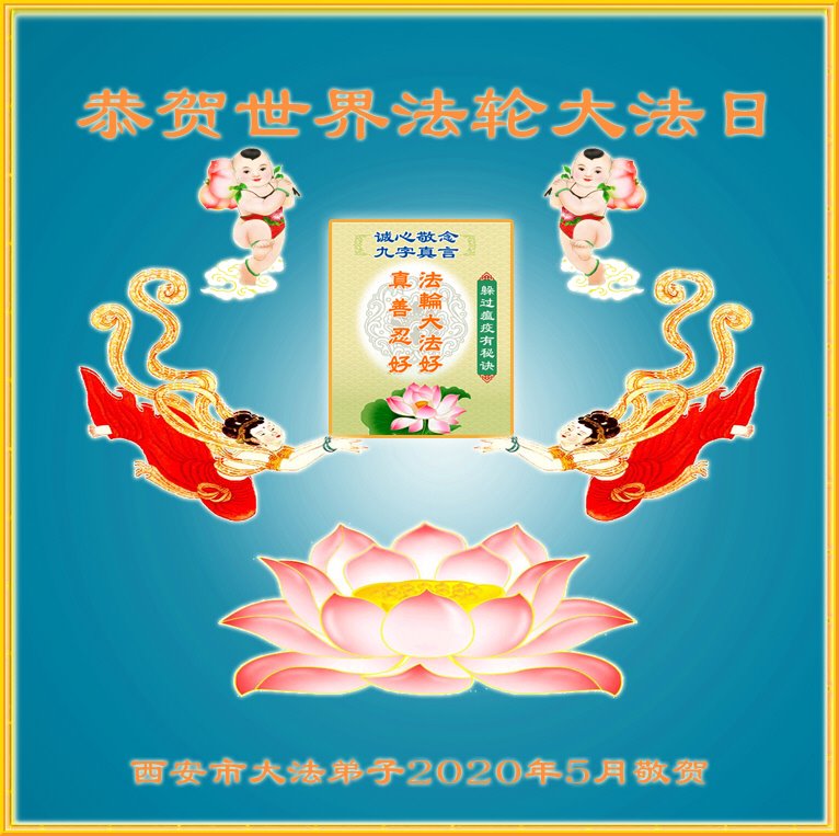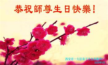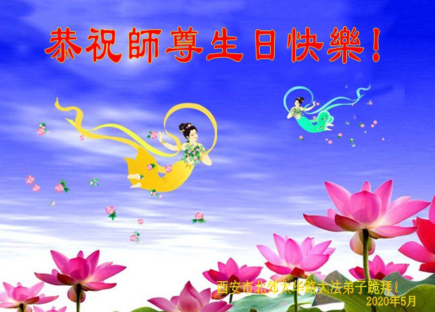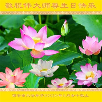 【明慧网二零二零年五月十二日】 陕西省西安市东郊大法弟子恭祝师尊生日快乐!庆祝世界法轮大法日!