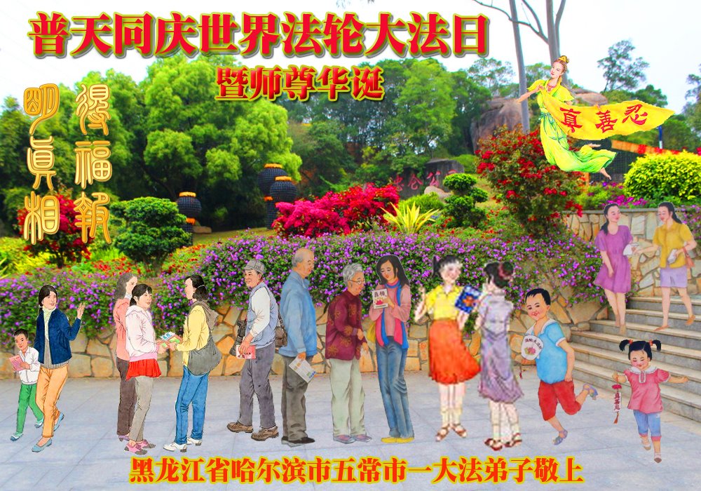 法轮大法好! 黑龙江哈尔滨市道里区大法弟子恭贺世界法轮大法日!恭祝师尊生日快乐!