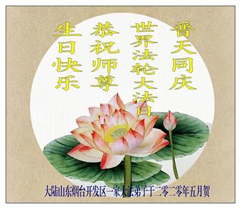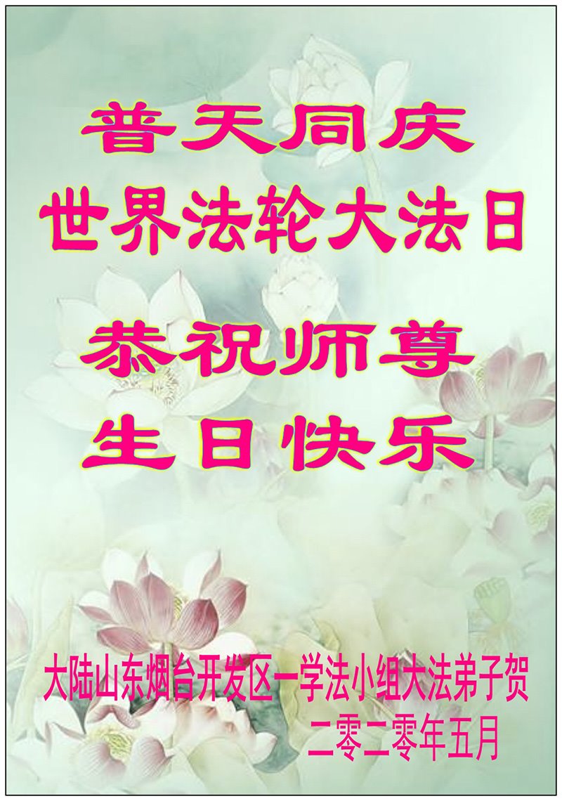 【明慧网二零二零年五月十二日】 山东烟台开发区全体大法弟子恭贺世界法轮大法日!恭祝师尊生日快乐!