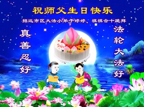 山东省烟台市招远市区姊妹俩大法弟子恭祝慈悲伟大的师尊生日快乐!