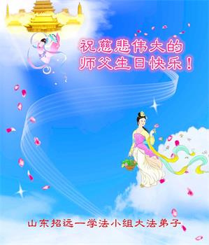 山东省烟台市招远市张星一学法小组大法弟子恭贺世界法轮大法日!恭祝伟大的师尊生日快乐!