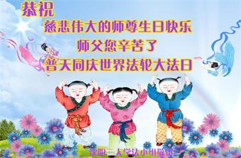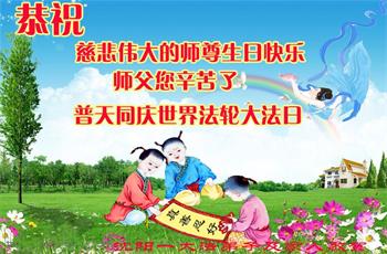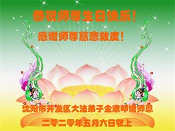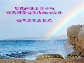 普天同庆世界法轮大法日! 恭祝师尊生日快乐!师父您辛苦了!普天同庆法轮大法日! 辽宁省沈阳市一大法弟子及家人恭祝师尊生日快乐!