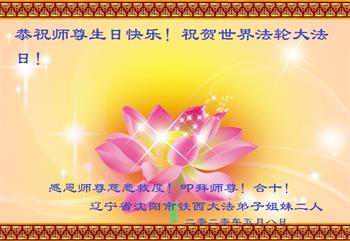 辽宁省沈阳市铁西大法弟子姐妹二人恭祝师尊生日快乐!祝贺世界法轮大法日!