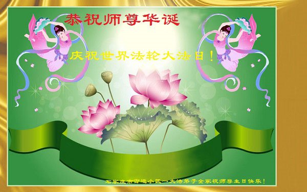五月十三日是法轮大法洪传世间二十八周年的日子,也是师尊华诞的大喜日子!在这普天同庆的时刻,我们全家人恭祝慈悲伟大的师尊生日快乐!我一人炼功全家人受益;女儿结婚六年一直没有怀孕,她非常支持我修炼,在诉江大潮中她积极参与诉江,帮忙邮寄诉江状,转过年喜得小宝宝,现在已经4周岁,非常健康,会背多首师父的《洪吟》,会唱“法轮大法好、跟着师父走”等歌曲。 儿子也在大法中受益,他腿有残疾不适合干体力工作,也找到了很适合自己干的工作,并且工资很可观。丈夫一直都支持我修炼,他每天任劳任怨,我肢体残疾,只要是大法的事他也给我帮忙。女婿开长途,一次晚上在高速疾驶,他当时困了有点迷糊,忽然有一个声音叫他,他清醒了一看车快开到一边了,这件事他至少告诉我两次了。我们全家人用尽人间所有的语言也表达不尽对师尊的无限感恩!弟子唯有听师父的话,精進实修,把师父赐予世人的灵丹妙药传递给每一个众生,多救人。最后我们全家人再次恭祝慈悲伟大的师尊生日快乐! 河北石家庄建明大法弟子恭祝师父生日快乐!恭贺世界法轮大法日!