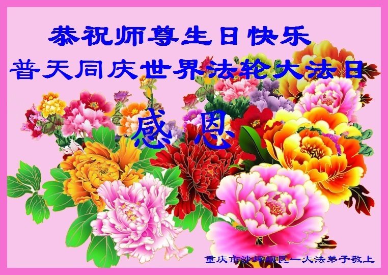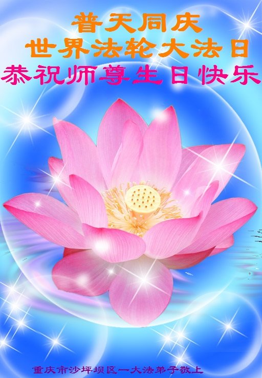 弟子们在师尊的慈悲保护下走过了无数坡坡坎坎,都离不开师尊的慈悲保护才走到今天!弟子用尽人间语言也感恩不尽师恩浩荡!弟子只有尽最大努力做好师尊要求做的三件事来略表感恩之意!弟子们盼望能早日跪迎师尊回国团聚!重庆市一大法弟子全家叩拜师尊! 重庆市双碑一学法组大法弟子恭祝慈悲伟大的师尊生日快乐!庆贺世界法轮大法日的到来!