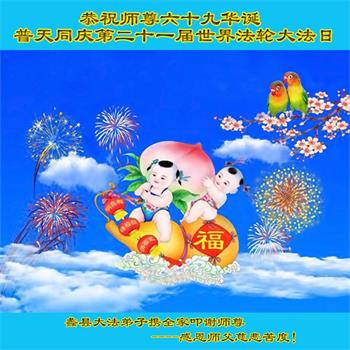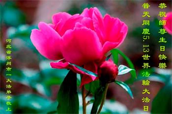 恭祝慈悲伟大的师尊生日快乐!感恩师尊慈悲救度! 河北省涿州市大法弟子敬上 河北保定西郊一学法小组全体大法弟子恭祝师尊生日快乐!普天同庆法轮大法洪传二十八周年!同庆同祝世界法轮大法日!