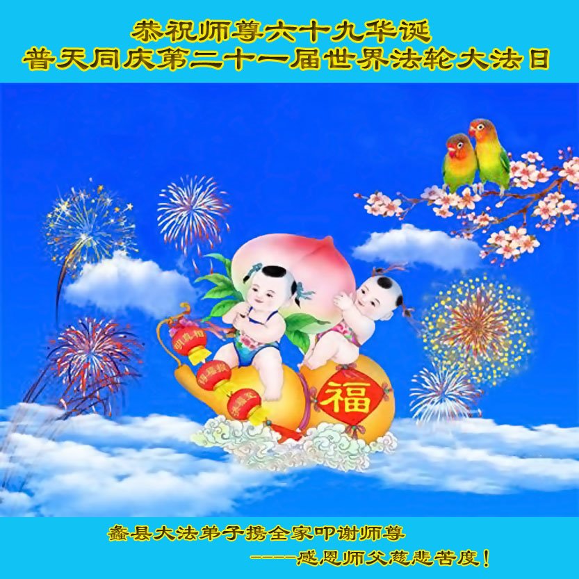 河北保定西郊一大法弟子全家恭祝师尊生日快乐!普天同庆法轮大法洪传二十八周年!同庆同祝世界法轮大法日!