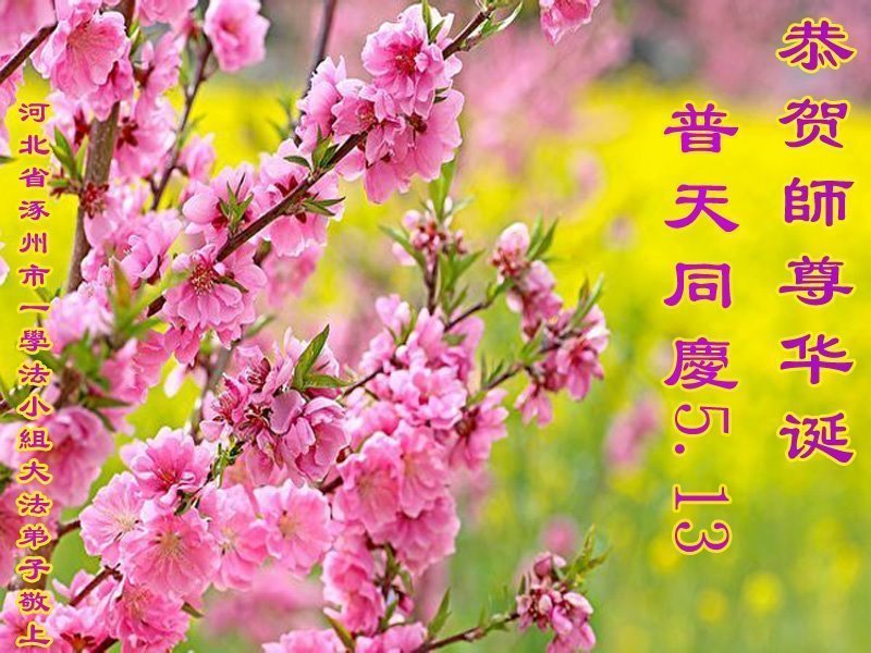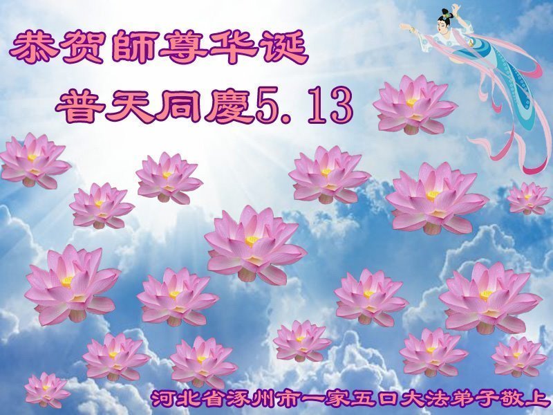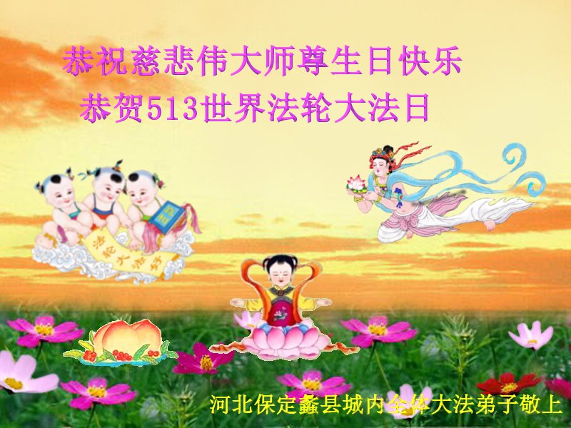 恭祝慈悲伟大的师尊生日快乐!弟子一定向内找修自己,形成整体,做好三件事!感恩师尊慈悲救度! 河北省涿州市一家五口大法弟子敬上 河北省保定容城县一学法小组大法弟子恭祝慈悲伟大的师父生日快乐!普天同庆同贺5.13世界法轮大法日!