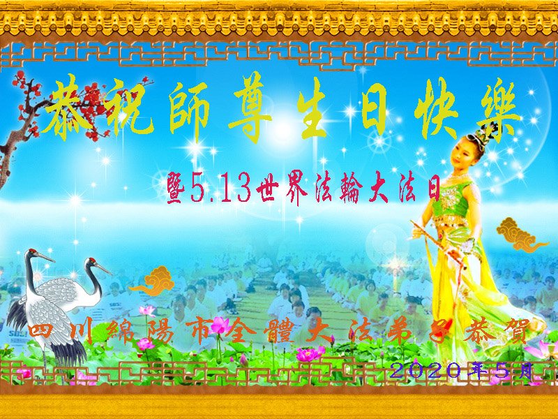 恭贺5.13世界法轮大法日! 弟子要多学法,修好自己。多救人,用实际行动感恩师尊的慈悲救度。 四川省绵阳市全体大法弟子恭祝师尊生日快乐!