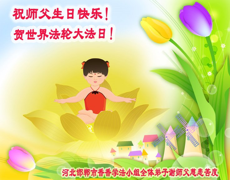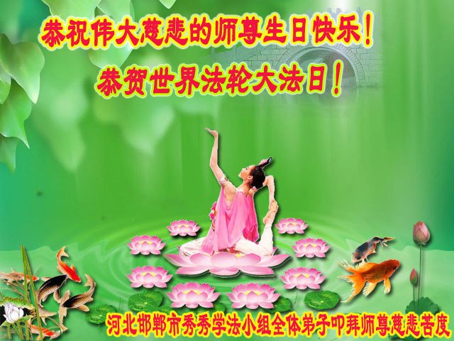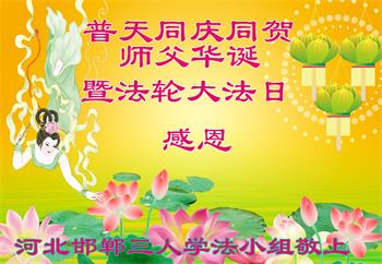 河北邯郸三人学法小组全体大法弟子恭祝慈悲伟大的师尊生日快乐!恭贺法轮大法日!