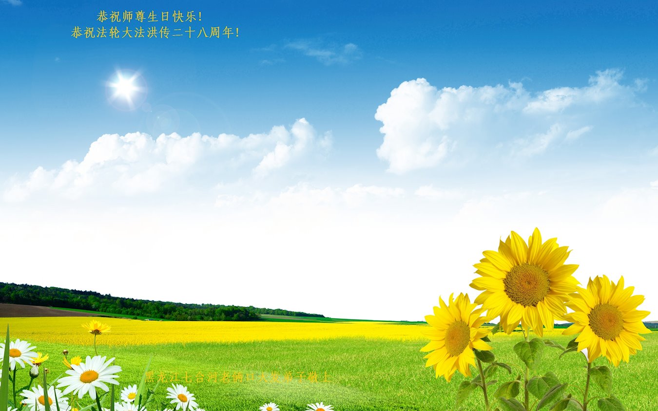 恭祝法轮大法洪传二十八周年! 弟子真心感谢师父的慈悲保护,今后在师父的加持下更加精進,更加努力做好三件事,让师父多一些欣慰。少一些操劳。叩拜师尊! 黑龙江七台河一家四口大法弟子敬上, 黑龙江省绥阳镇大法弟子恭祝师父生日快乐!