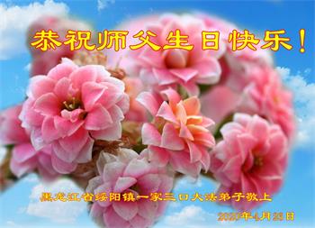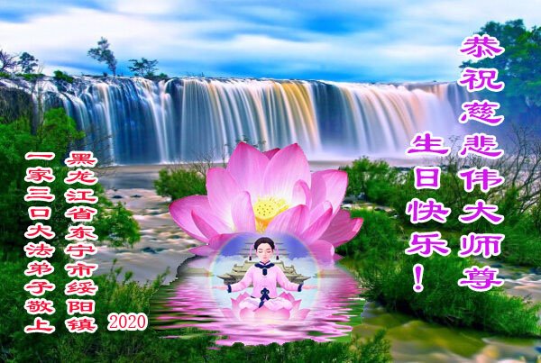 黑龙江省绥阳镇大法弟子一家三口恭祝师尊生日快乐!