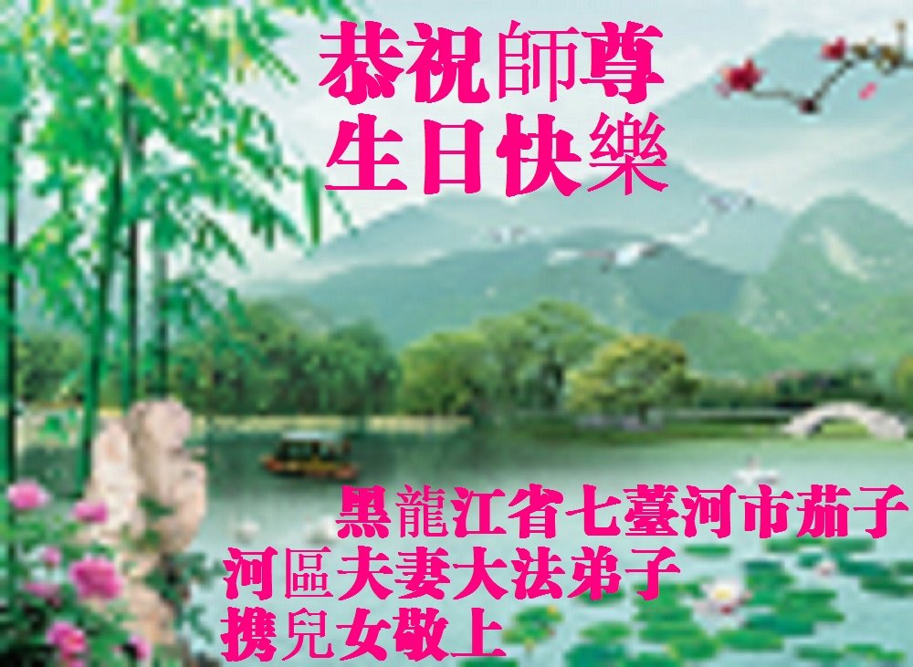 黑龙江省七薹河市茄子河区夫妻大法弟子携儿女恭祝师尊生日快乐!