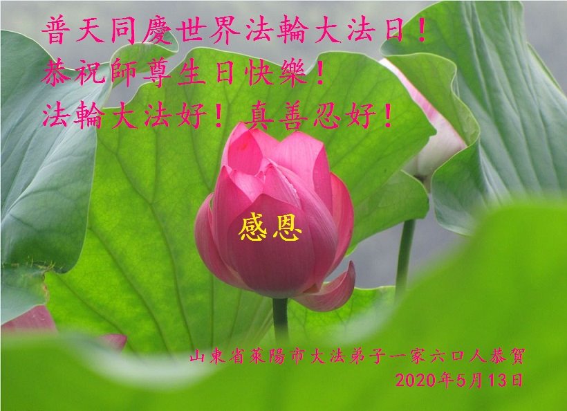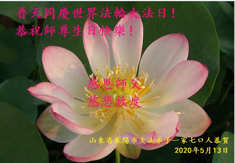 感谢师尊对弟子和家人的慈悲救度!在以后的日子里,我们要更加精進,做好三件事,跟师父回家。 山东省淄博市临淄区大法弟子庆祝5.13世界法轮大法日!恭祝师父生日快乐!淄博市临淄区大法弟子合十敬上!