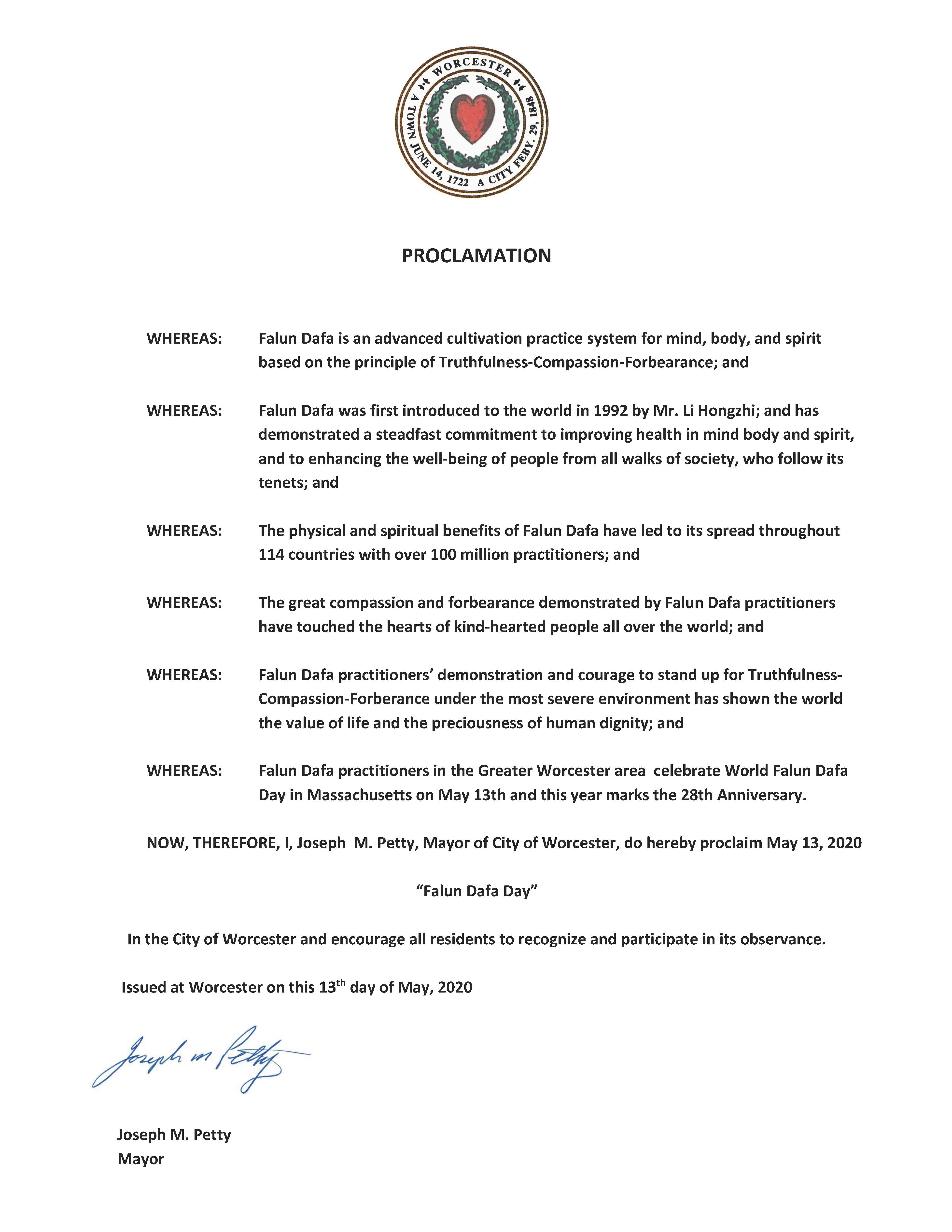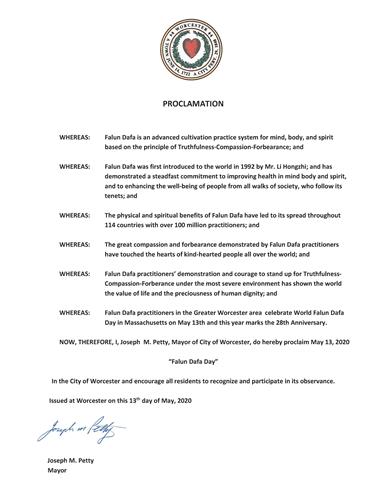 | 【明慧网二零二零年五月十二日】二零二零年五月,美国麻州渥斯特市(Worcester )市长颁发了祝贺法轮大法日的褒奖,并宣布二零二零年五月十三日为“法轮大法日”。约瑟夫.佩提(Joseph M. Petty)在褒奖信中赞扬了法轮大法修炼者“为了捍卫它们而在最严酷环境下坚持的勇气,向世界展现了生命的价值和人类尊严的宝贵。” 以下是褒奖信译文: 褒奖 鉴于:法轮大法是依据真、善、忍原则提升思想、身体和精神的上乘修炼方法; 鉴于:法轮大法由李洪志先生从1992年开始传扬到世界,在改善身心和精神健康方面展现出切实的功效,而且提升了社会上所有信仰者的幸福; 鉴于:法轮大法的身心效益令它传播到114个国家,吸引超过1亿修炼者; 鉴于:法轮大法修炼者伟大的慈悲和坚忍感动了全世界的善良人们; 鉴于:法轮大法修炼者展现的真、善、忍品质,以及为了捍卫它们而在最严酷环境下坚持的勇气,向世界展现了生命的价值和人类尊严的宝贵; 鉴于:5月13日,大渥斯特地区的法轮大法修炼者在麻州庆祝第28届世界法轮大法日; 因此:我,佩提,渥斯特市市长,宣布2020年5月13日为“法轮大法日”,并鼓励所有渥斯特市居民认可和参与这个庆祝。 2020年5月13日于渥斯特市发布。 约瑟夫.佩提(Joseph M. Petty) 市长