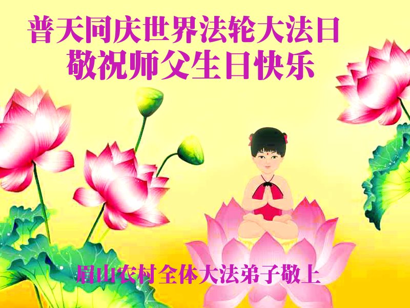 恭贺世界法轮大法日! 认真学法,悟法,精進去执着,正法不结束救人不停止。 四川省眉山农村全体大法弟子敬祝慈悲伟大的师父生日快乐!