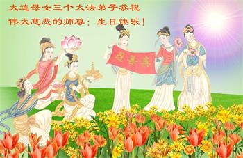 辽宁省大连市母女三位大法弟子恭祝慈悲伟大的师尊生日快乐!庆贺世界法轮大法日!