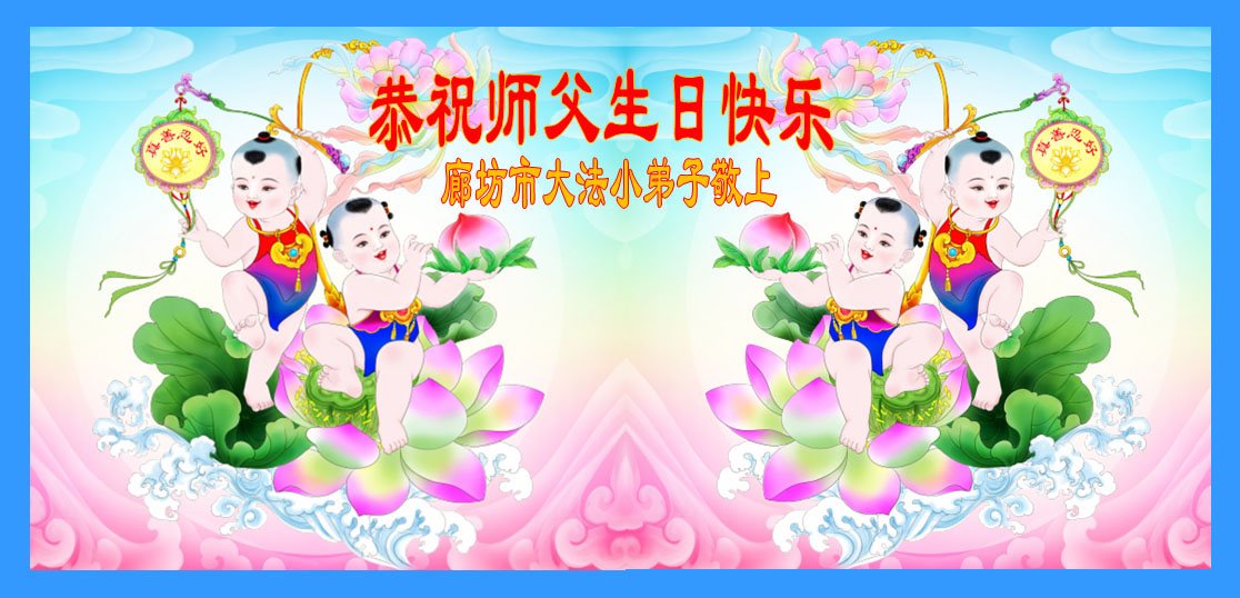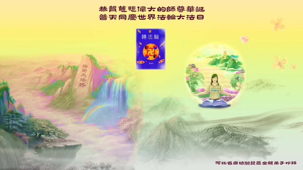 年年盼师尊 亿万弟子盼师尊早日回大陆 弟子以在大法中修出的纯净之心迎师尊 弟子要修好自己、无私无我、真心救人 完成使命才配是大法弟子 请师父放心,我们努力、再努力 达到大法弟子的标准,迎接师尊回大陆! 河北省廊坊地区大法弟子全家恭祝师尊生日快乐!庆贺“五一三”法轮大法日!