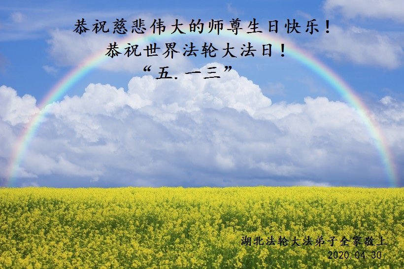 慈悲伟大的师尊您好!五月十三日是您的生日,也是世界法轮大法日,在这普天同庆的日子里,弟子们更加想念您!是您将宇宙大法洪传给众生,拯救了穹宇中众生的生命;是您将弟子们从地狱中捞起洗净,让我们找回了真我!弟子们一定珍惜您的巨大付出与承受,跟师尊回家。 湖北省全体大法弟子敬上 2020年4月28日 |