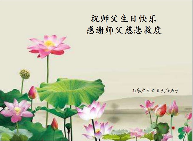 弟子怀着万分感恩的心情敬祝师尊生日快乐!是师父为我们指明了生命的归途,是师父保护着我们渡过了一次次劫难。在正法的最后阶段,我们要坚信师父坚定大法,精進如初,多学法,遇事向内找,用法的标准严格要求自己的一思一念。理智智慧的让更多的有缘人明真相得救度。 弟子跪谢师尊救度洪恩!合十! 河北省石家庄市无极县大法弟子恭祝师父生日快乐!