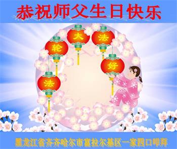 恭贺五一三世界法轮大法日! 黑龙江省齐齐哈尔市富拉尔基区一家四口恭祝师父生日快乐!