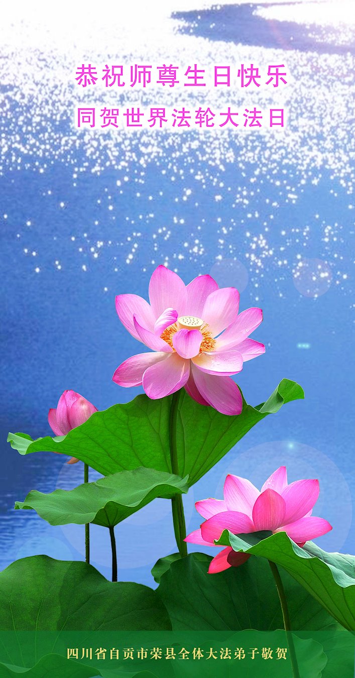 庆贺五·一三世界法轮大法日! 回归 粉莲映朝阳 亭亭立世上 邪雨腥风去 随师归净苍 四川省自贡市贡井区全体大法弟子恭祝师尊华诞!